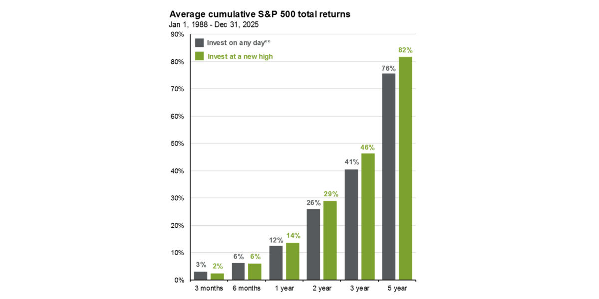 That said it's normal to see a market correction each year, the S&P 500 has averaged a 13.8% peak-to-trough decline annually since 1929, volatility is a feature not a bug. It's also worth noting that investing at all-time highs isn't as risky as it feels. History suggests that long-term returns from new highs have been surprisingly similar to overall returns.