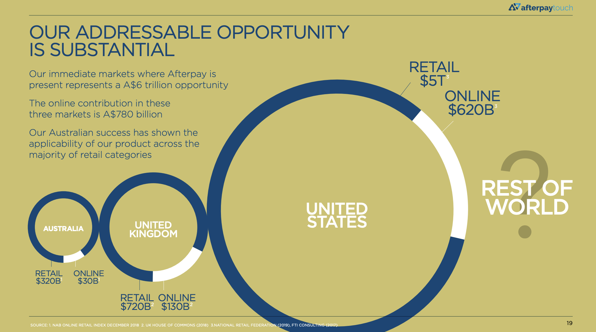 The addressable market size is now trillions. Afterpay is targeting gross sales of AUS$20 billion by 2022.