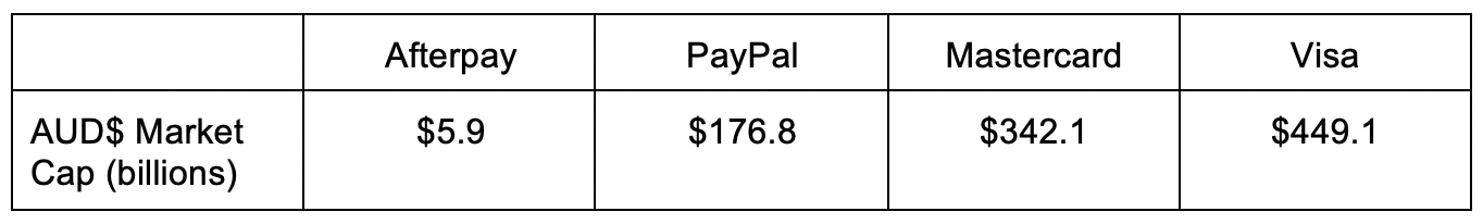 We think it’s interesting to compare the market value of Afterpay to PayPal, Visa and Mastercard. Although Afterpay is not globally accepted and recognised like the other payment companies but it's an interesting comparison of what could be if this trend of millennials ditching credit cards for buy now pay later services continues.