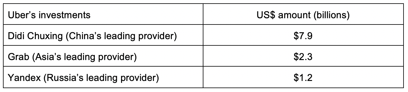 SoftBank is a Japanese telecommunications company that runs the largest technology venture capital fund in the world (approximately US$100 billion) — also known as the Vision Fund. SoftBank invested $7.7 billion in return for a 16.3 per cent stake in Uber.