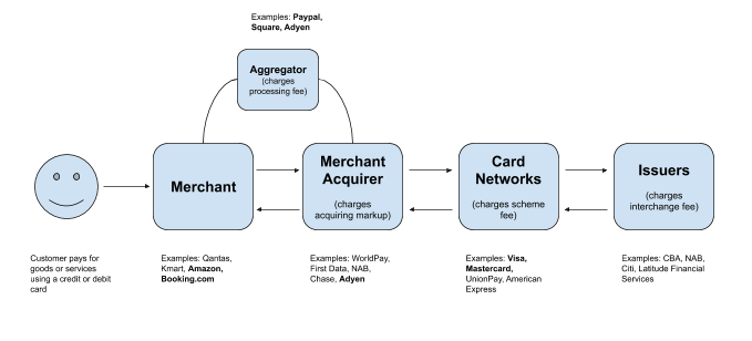 However, in reality, the transaction data from your coffee purchase passes through a complicated chain of different entities. We’ve drawn a simplified flow chart below that maps the main entities.
